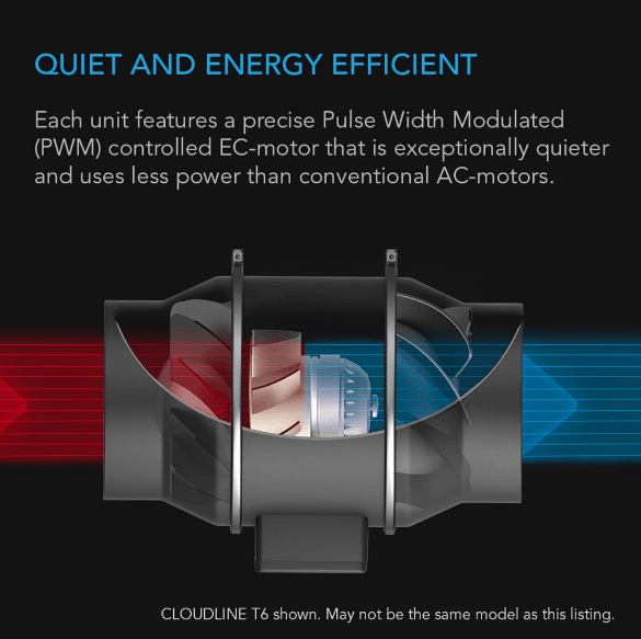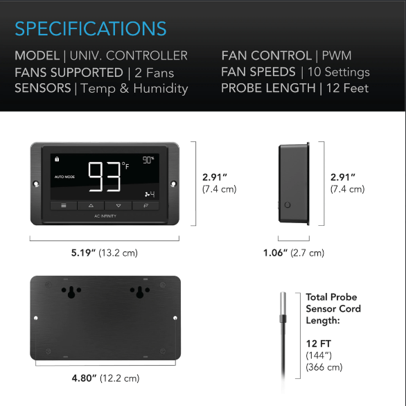 The controller can be programmed to adjust fan speeds to respond to varying high and low temperatures, and humidity. For ventilation applications, the controller can be set to run continuously, or triggered to run at customizable speeds when given power, due to its backup memory capability. Additional features includes a countdown timer, alarm system, and eco-mode. Includes detachable 12-foot precision probe that is water resistant. This EC smart controller can power and control 2 inline duct fans of any size, such as this CLOUDLINE T6 with a CLOUDLINE S4.